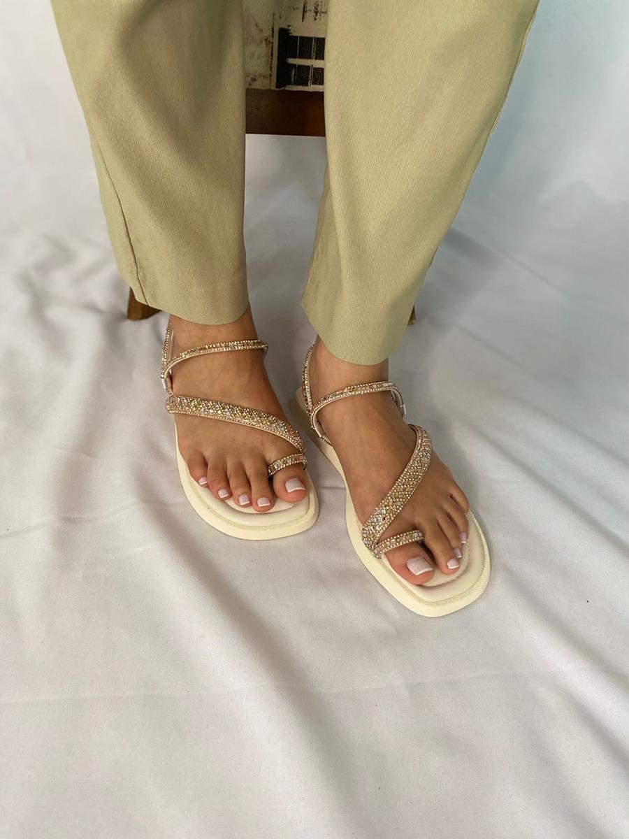 nude, com tiras finas em formato assimétrico que cruzam sobre o pé. As tiras