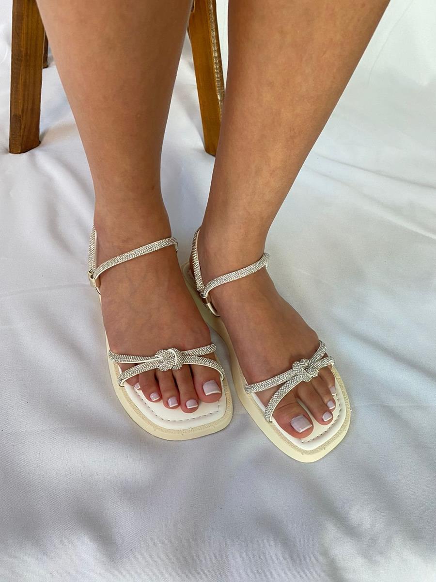 A sandália rasteira Nó de Luz de estilo elegante e delicado, no tom claro (off-white) com base quadrada e palmilha levemente acolchoada, que proporciona conforto. As tiras são finas, revestidas por pedrarias prateadas brilhantes (strass), formando um desenho elegante com dois nós decorativos — um na frente, sobre os dedos, e outro mais ao lado. Uma tira envolve o tornozelo de forma delicada, trazendo segurança e estilo.