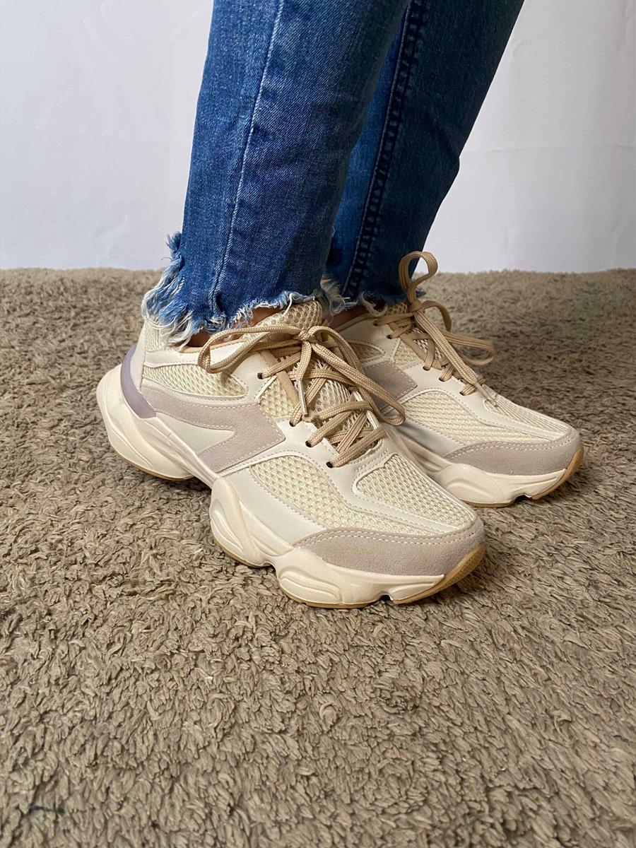 Cadarços: bege claro, combinando com a paleta neutra e clean.