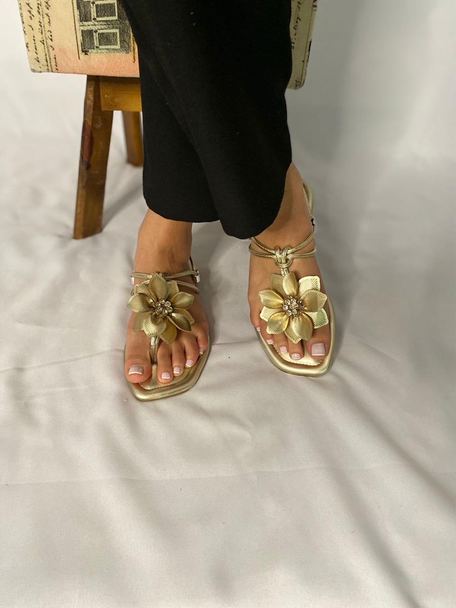 a aplicação de uma flor metálica em alto-relevo no peito do pé. A flor tem