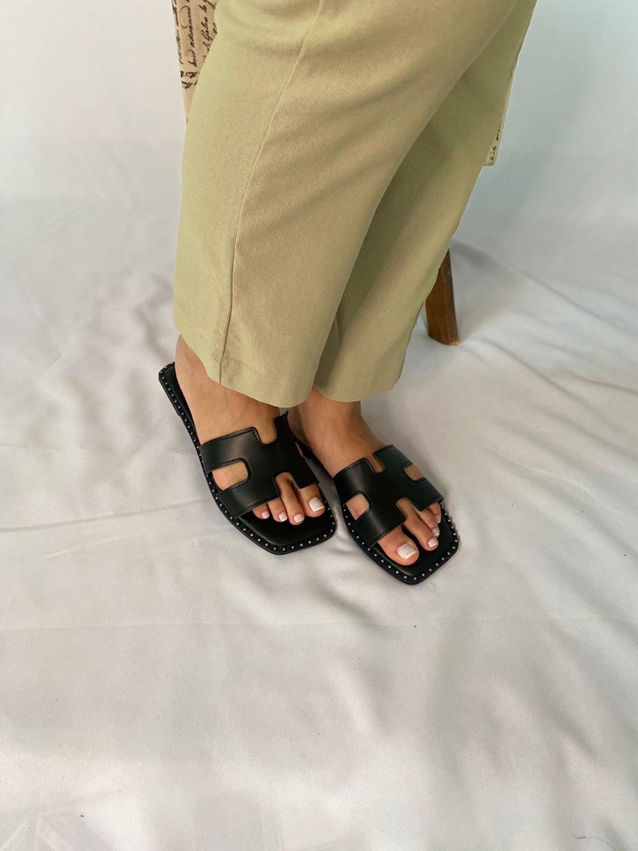 Design: Tira larga em forma de "H", com solado de bico quadrado.
